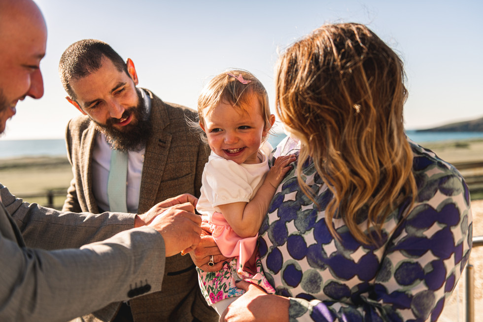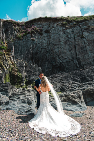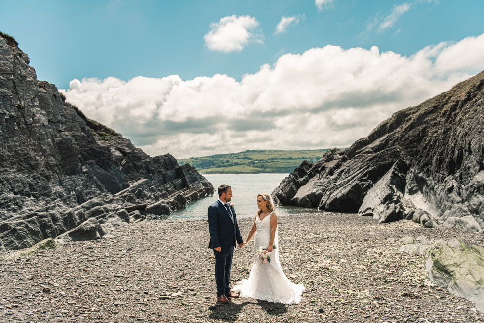 After the ceremony we took some portraits on the cliffside overlooking Cardigan bay and then took a walk down a steep rocky path to a secluded cove below. See the photo of Claire taking off her shoes halfway down to the beach!