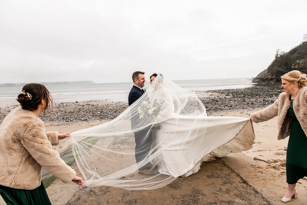 It was time to head to the beach with the bridal party. If you live near the coast you'll know that when it's windy at the beach, it is WINDY at the beach! These guys took it like champs and although they were freezing, Hannah's bridesmaids stayed to help tame her long veil so we could get some stunning dramatic shots of the couple. Scroll to see a behind the scenes shot of the bridesmaids giving us a helping hand!